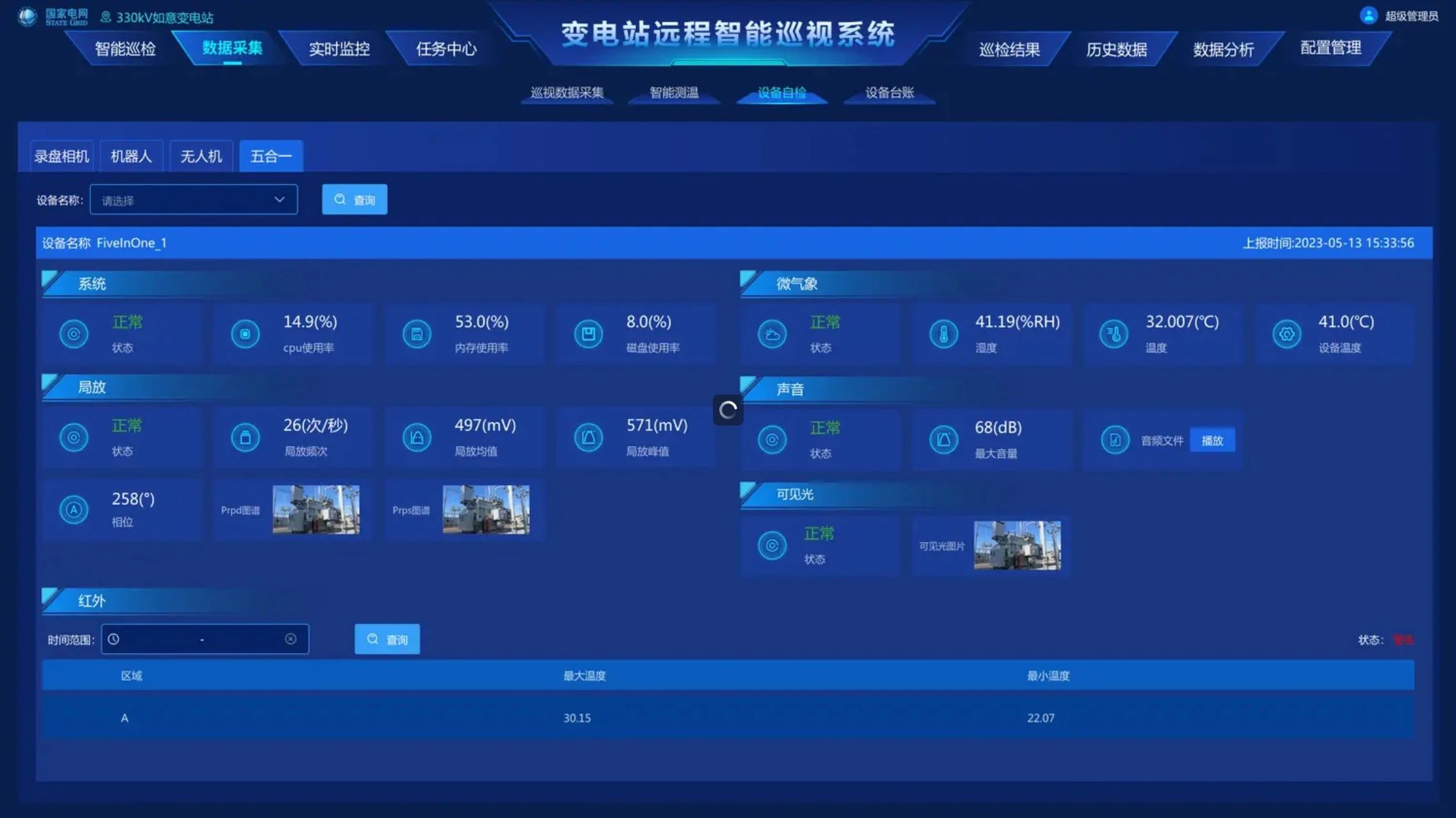 通過機器人系統(tǒng)、高清視頻系統(tǒng)、紅外在線系統(tǒng)、聲紋采集裝置等方式聯(lián)合采集巡視數(shù)據(jù),完成變電站全面運行數(shù)據(jù)采集,構(gòu)建數(shù)字化變電站數(shù)據(jù)基礎(chǔ)。具備表計識別、設(shè)備外觀識別功能完成30多類電力設(shè)備狀態(tài)分析,20多類典型缺陷識別,有效輔助人工完成現(xiàn)場巡視工作。