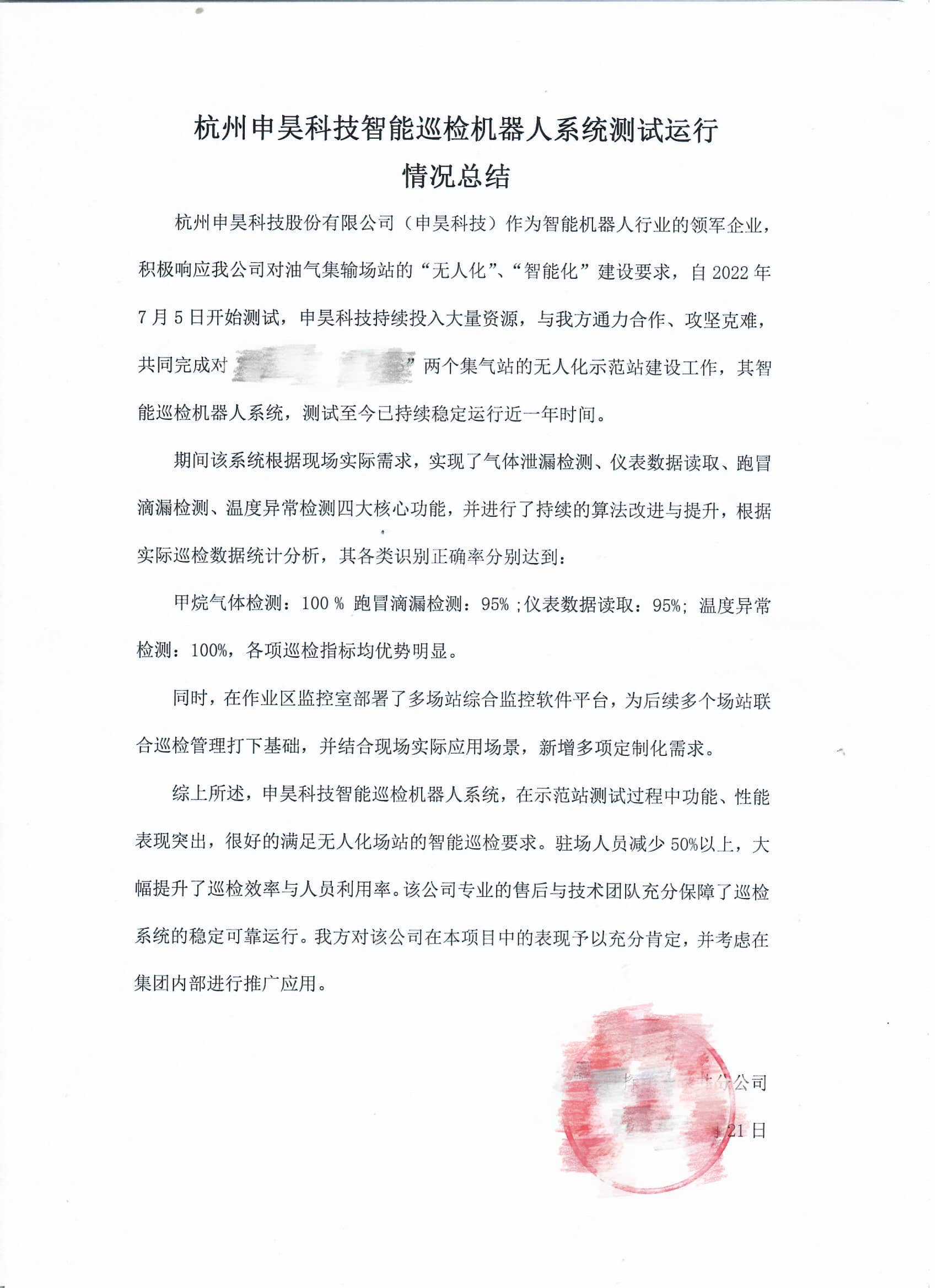 申昊科技積極響應(yīng)油氣集輸場站的“無人化”、“智能化”建設(shè)要求,與相關(guān)單位通力合作、攻堅克難共同完成示范站建設(shè)工作。如今油田多了一位“智能幫手”——申昊科技機器人智能巡檢系統(tǒng),成為了擁有智慧的“無人化場站”示范站,該系統(tǒng)已經(jīng)成功連續(xù)運行一年,獲得了客戶的高度評價。